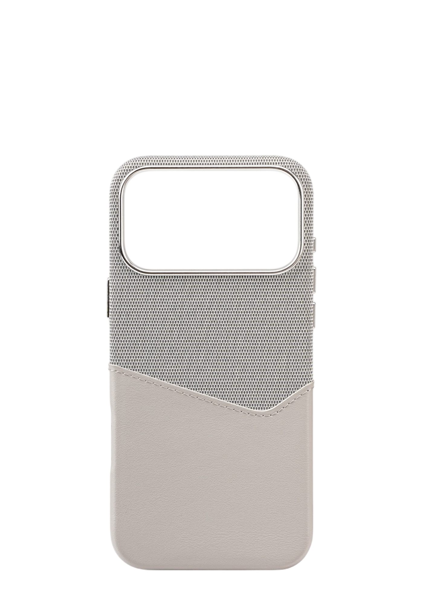 A stylish and functional iPhone case made from a blend of fabric and leather, featuring a card holder and MagSafe compatibility for seamless use.
